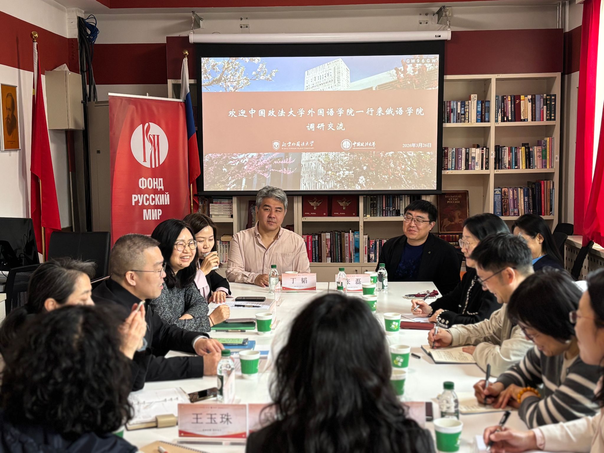 中国政法大学外国语学院党委副书记张艳萍,副院长张磊、田力男,英语语言文学研究所所长丁韬,俄语教师王玉珠、吴安娜,综合办主任马晓宇;北外日本av